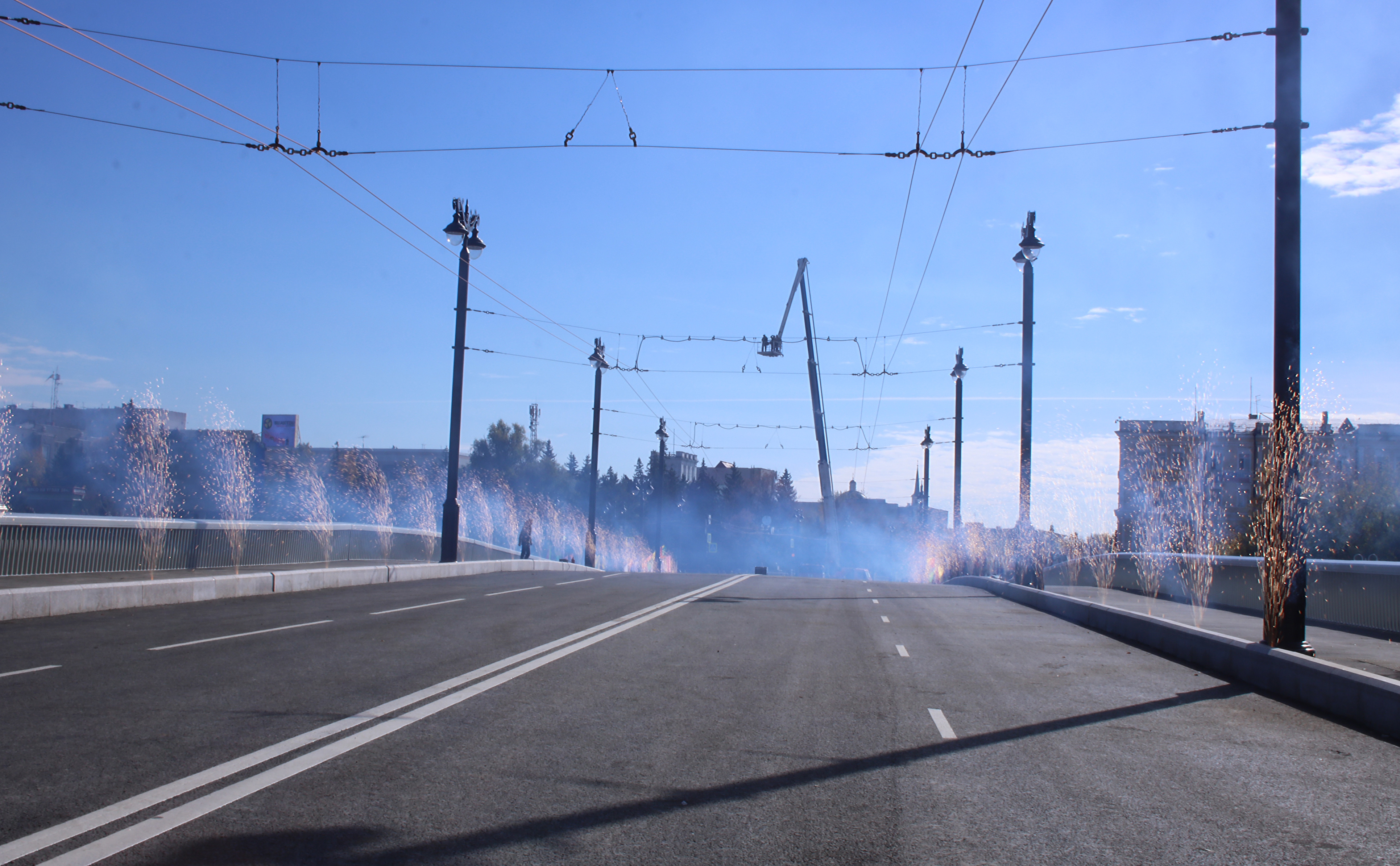 По состоянию на 1 октября текущего года, на объекте выполнен весь комплекс работ: ремонт бетонных поверхностей конструкций моста, монтаж центрального пролётного строения, устроены линии освещения, система дренажа, гидроизоляция, установлены бордюры, проведена облицовка лестничный сходов. Общая площадь покрытия проезжей и пешеходной частей объекта составляет порядка 3 тысяч квадратных метров.