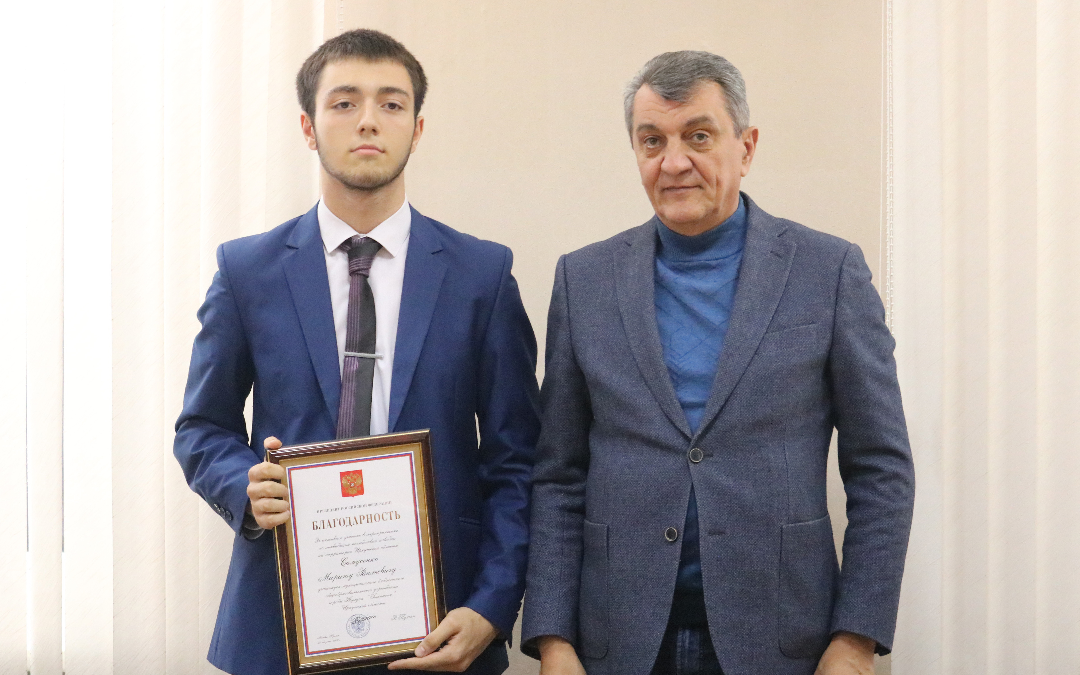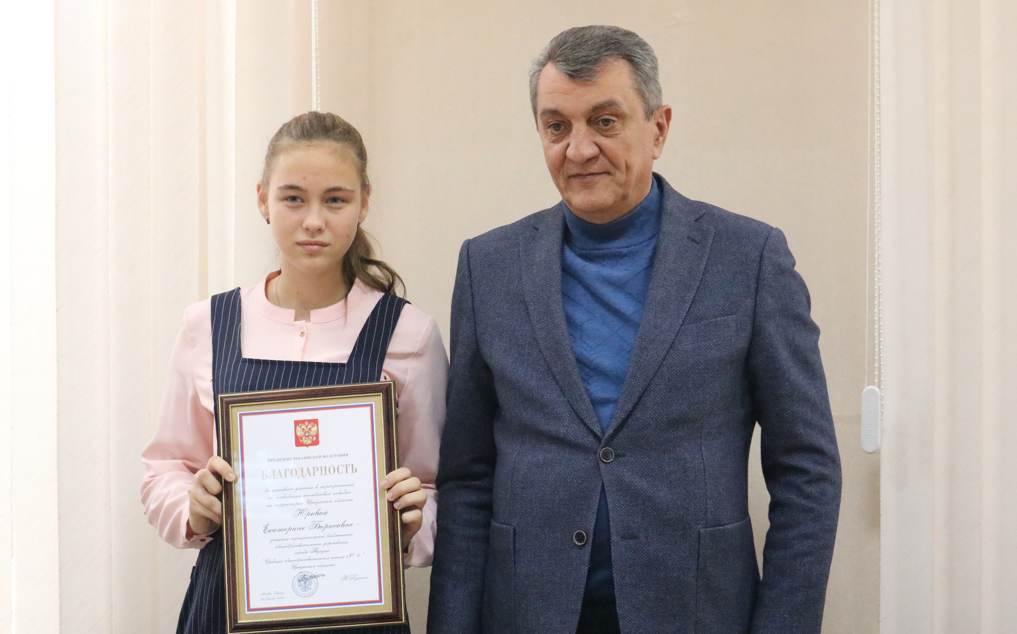 Полномочный представитель главы государства вручил Благодарность Президента Российской Федерации Марату Самусенко, Наталье Серых, Екатерине Юровой за активное участие в мероприятиях по ликвидации последствий паводка на территориях Иркутской области.