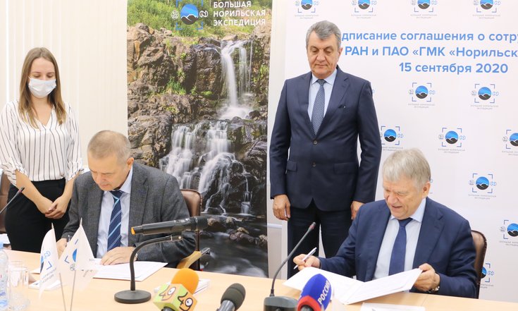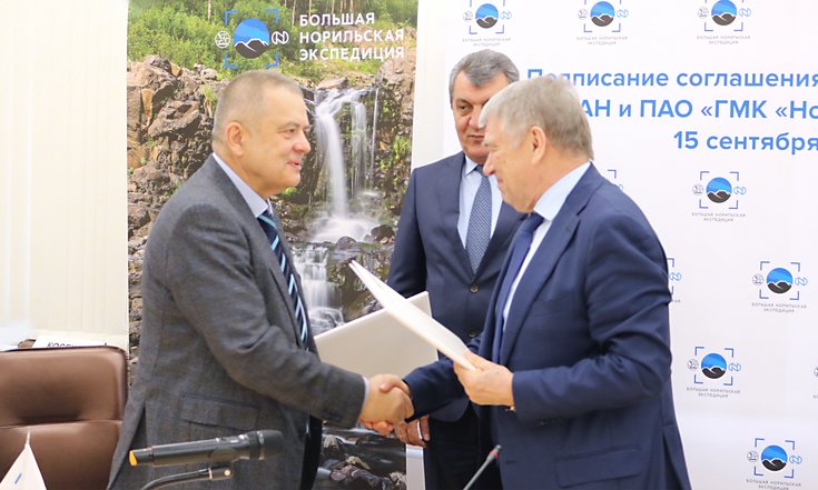 Сегодня состоялось подписание соглашения между Сибирским отделением Российской академии наук и ПАО «Горно-металлургическая компания «Норильский никель» о комплексном исследовании Арктики. Документ включает мероприятия по совместной реализации долгосрочной программы ликвидации последствий разлива нефтепродуктов в г. Норильске, а также выработке правил промышленного производства в Арктической зоне России с учетом принципов устойчивого развития, являющейся стратегической ресурсной базой страны и имеющей важнейшее геополитическое значение.