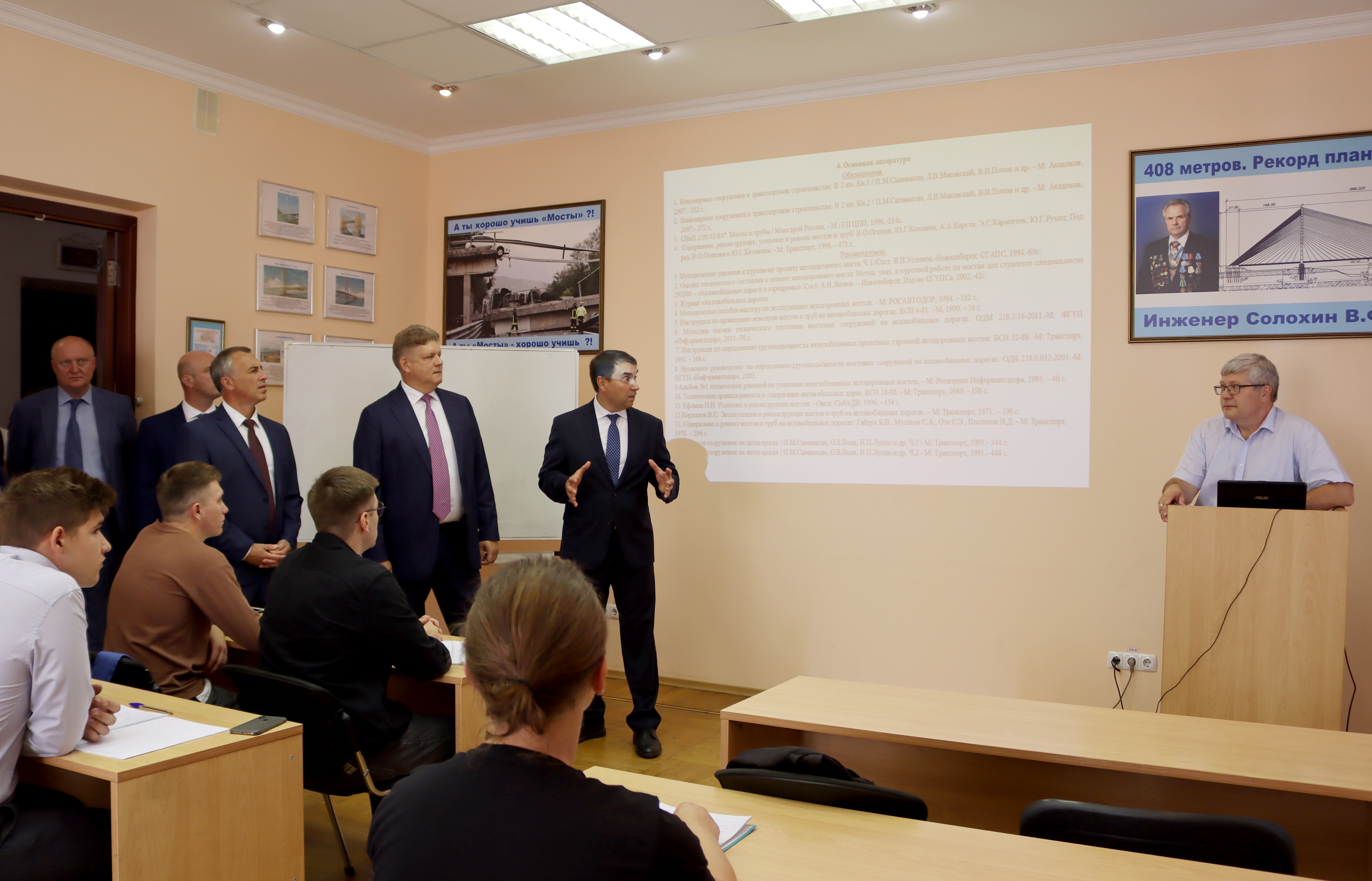 Полномочный представитель ознакомился с организацией учебного процесса, деятельностью лабораторий и научных центров вуза. В состав университета входят 10 факультетов, объединяющих 41 кафедру, Новосибирский техникум железнодорожного транспорта, а также Институт перспективных транспортных технологий и переподготовки кадров. Университет обладает хорошо оснащенной технической и лабораторной базой, необходимой для подготовки инженерных кадров и выполнения научных исследований. На территории вуза расположен учебный железнодорожный полигон площадью более 4 тысяч квадратных метров, оборудованный современной железнодорожной техникой.