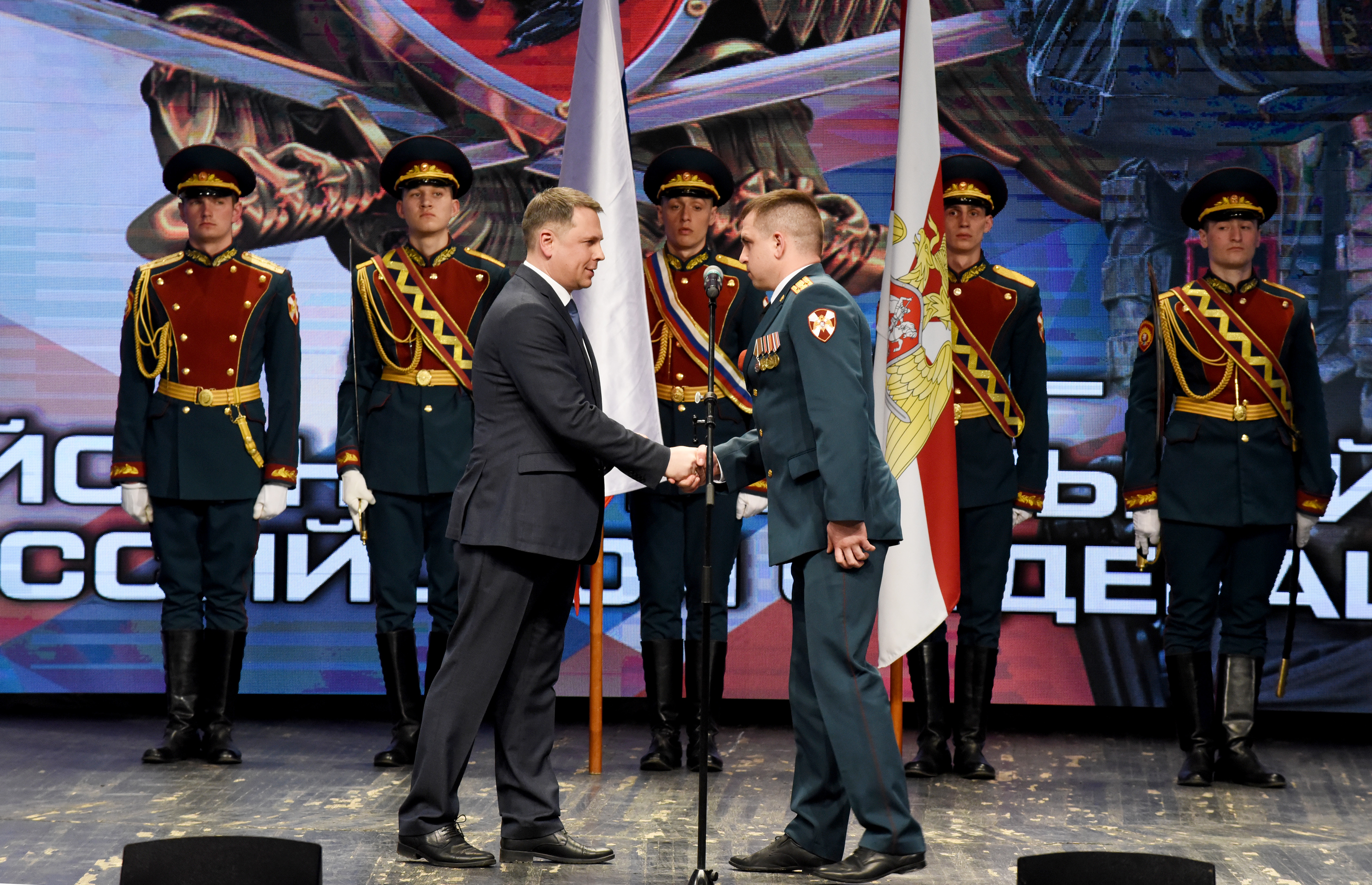 Он отметил, что современная обстановка в России характеризуется нарастанием различных вызовов и угроз. В связи с этим особую актуальность и значимость приобретают задачи борьбы с террористическими и экстремистскими проявлениями, охраны общественного порядка, обеспечения государственной безопасности. Замполпреда выразил уверенность, что серьёзное отношение к выбранной профессии и крепкая воинская дисциплина, а также имеющиеся в распоряжении военнослужащих технические возможности позволят им с честью выполнять возложенные государством задачи.