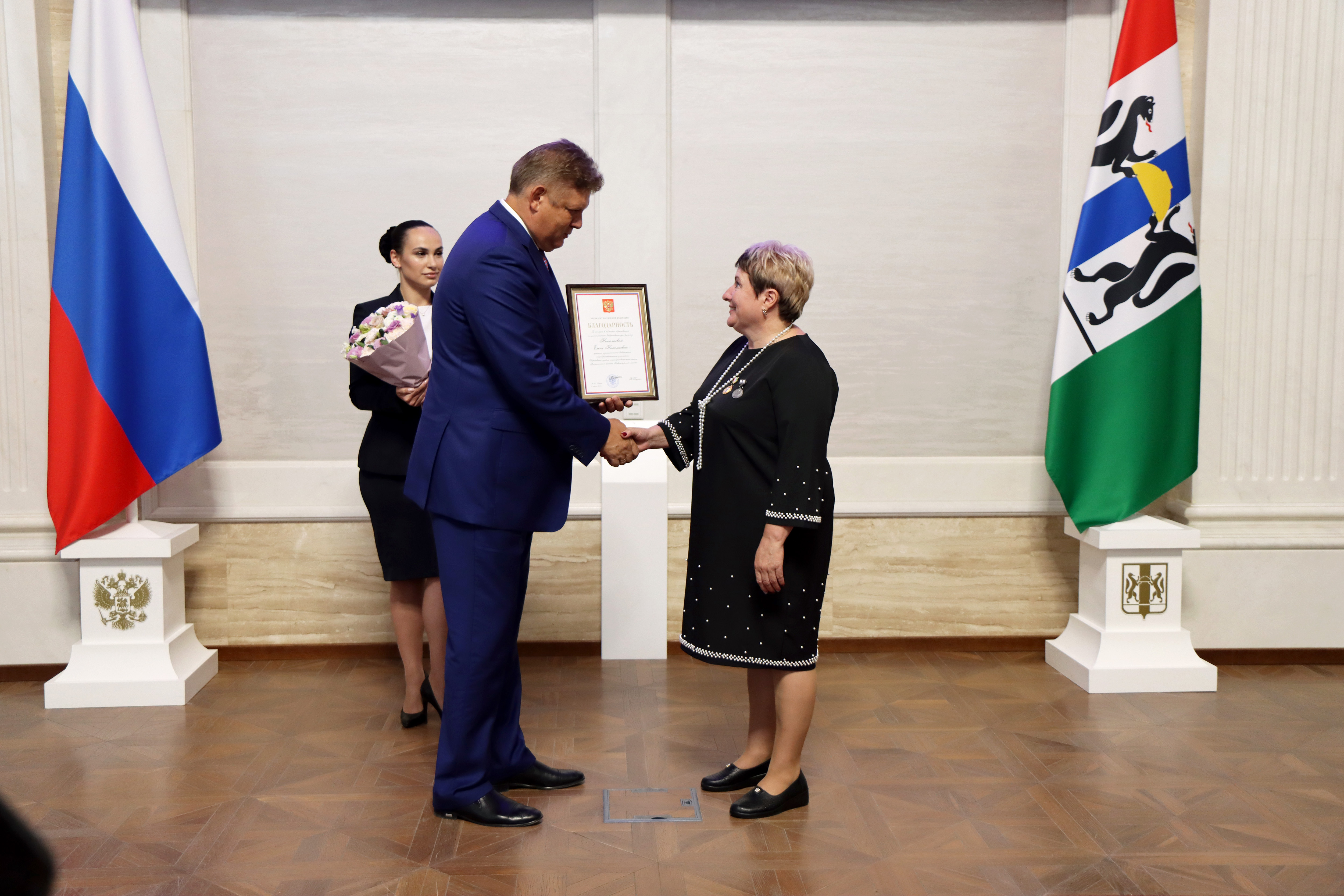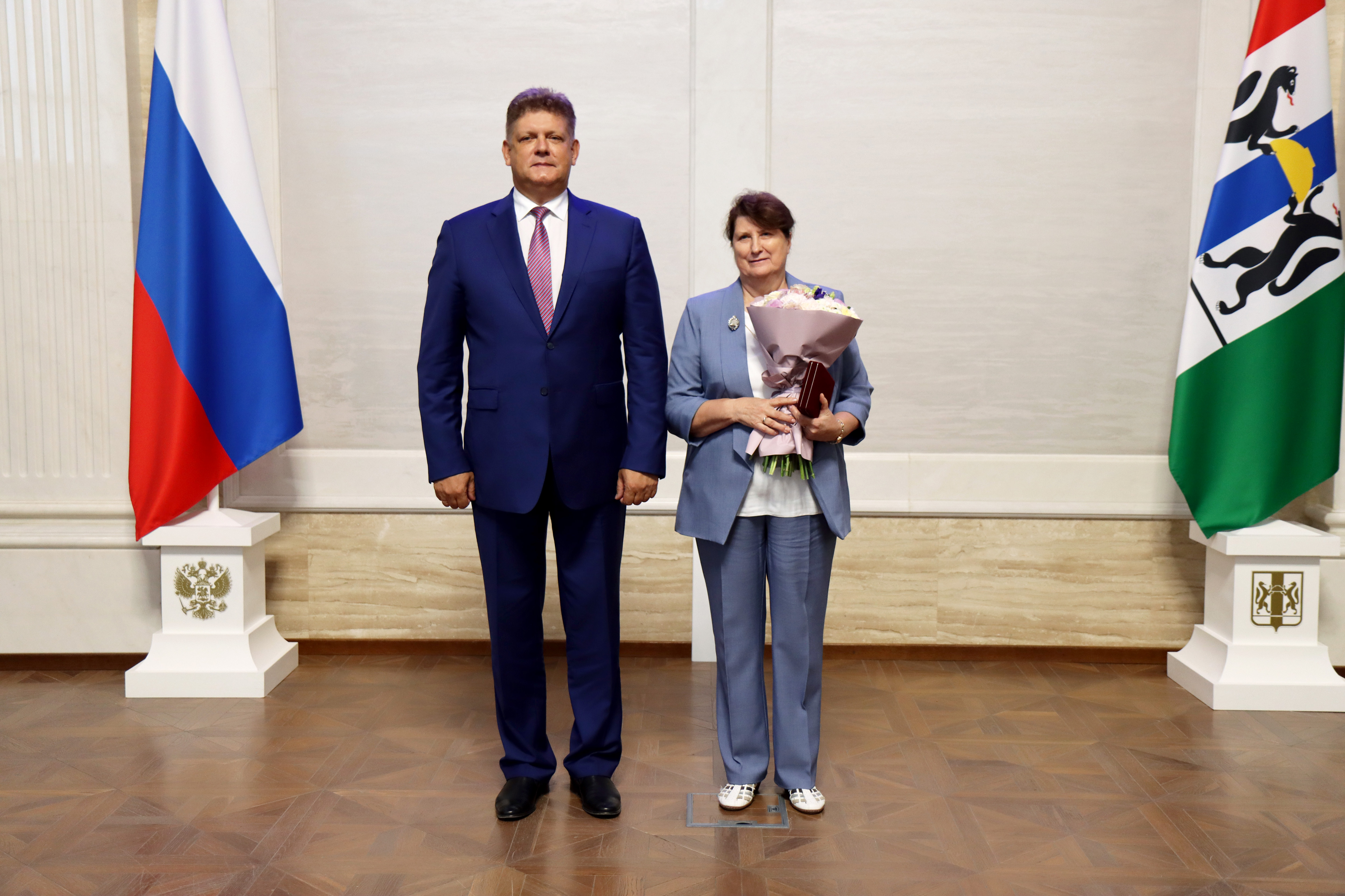 За заслуги в области социальной защиты населения и многолетнюю добросовестную работу звание «Заслуженный работник социальной защиты населения Российской Федерации» присвоено Любови Морозовой – заместителю руководителя клиентской службы Ленинского района государственного казенного учреждения Новосибирской области «Центр социальной поддержки населения г. Новосибирска». Благодарность Президента России объявлена председателю местной общественной организации «Совет предпринимателей малого и среднего бизнеса Заельцовского района» Виктору Мокровицкому – за активную общественную деятельность.