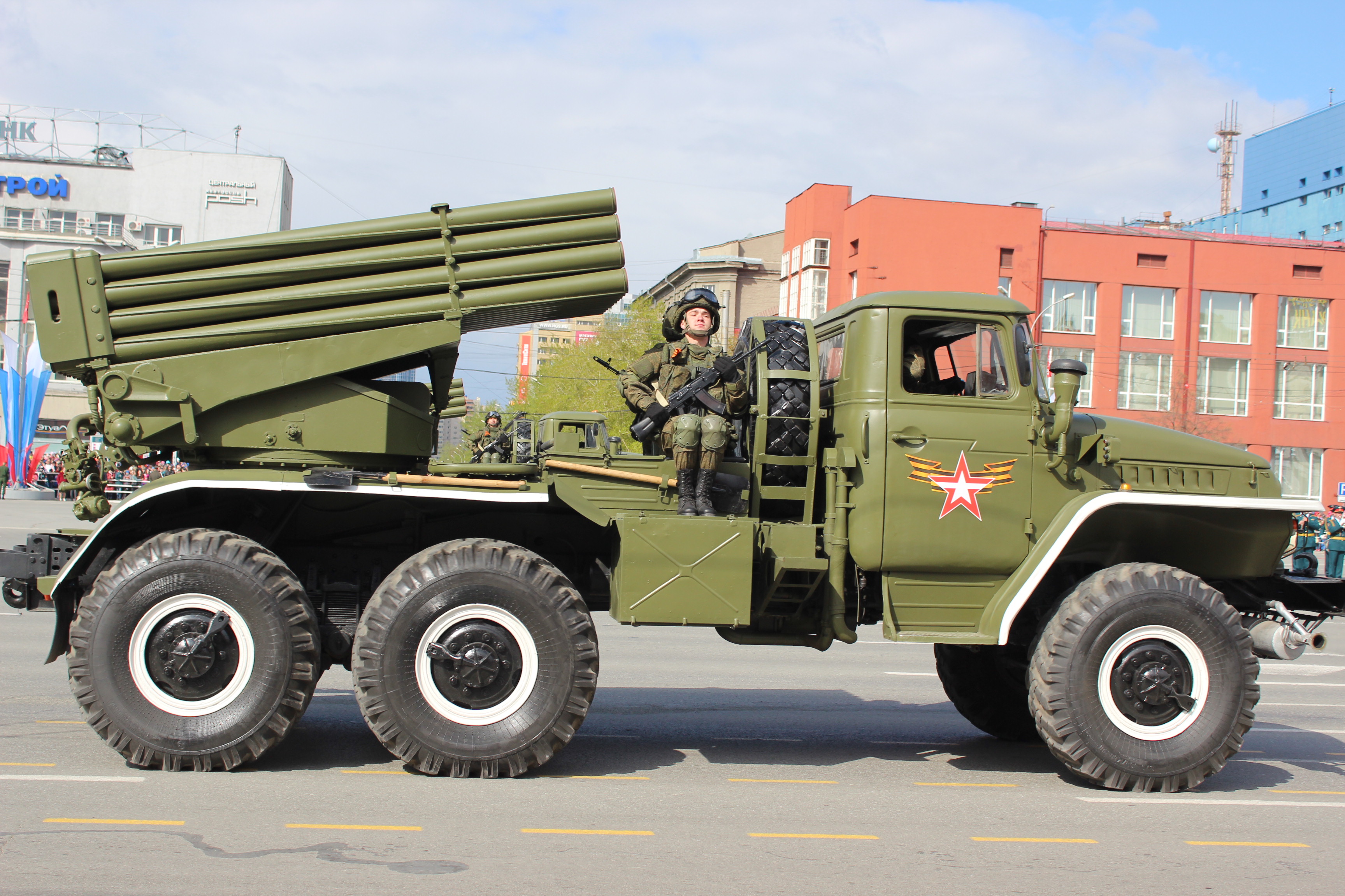В механизированной колонне парадного расчета - самая современная военная техника: бронеавтомобили «Тигр-М СпН», бронетранспортеры БТР-82, пушки МТ-12 «Рапира», 152-мм гаубицы «Мста-Б», боевые машины противотанкового комплекса «Конкурс», реактивные системы залпового огня «Град» и «Ураган», зенитно-ракетные комплексы «Оса» и С-400 «Триумф» и другие. Также в параде принял участие восстановленный танк Т-34. Авиация была представлена вертолетами Ми-8 и Ми-2, сверхзвуковыми истребителями МиГ-31 и Су-34.