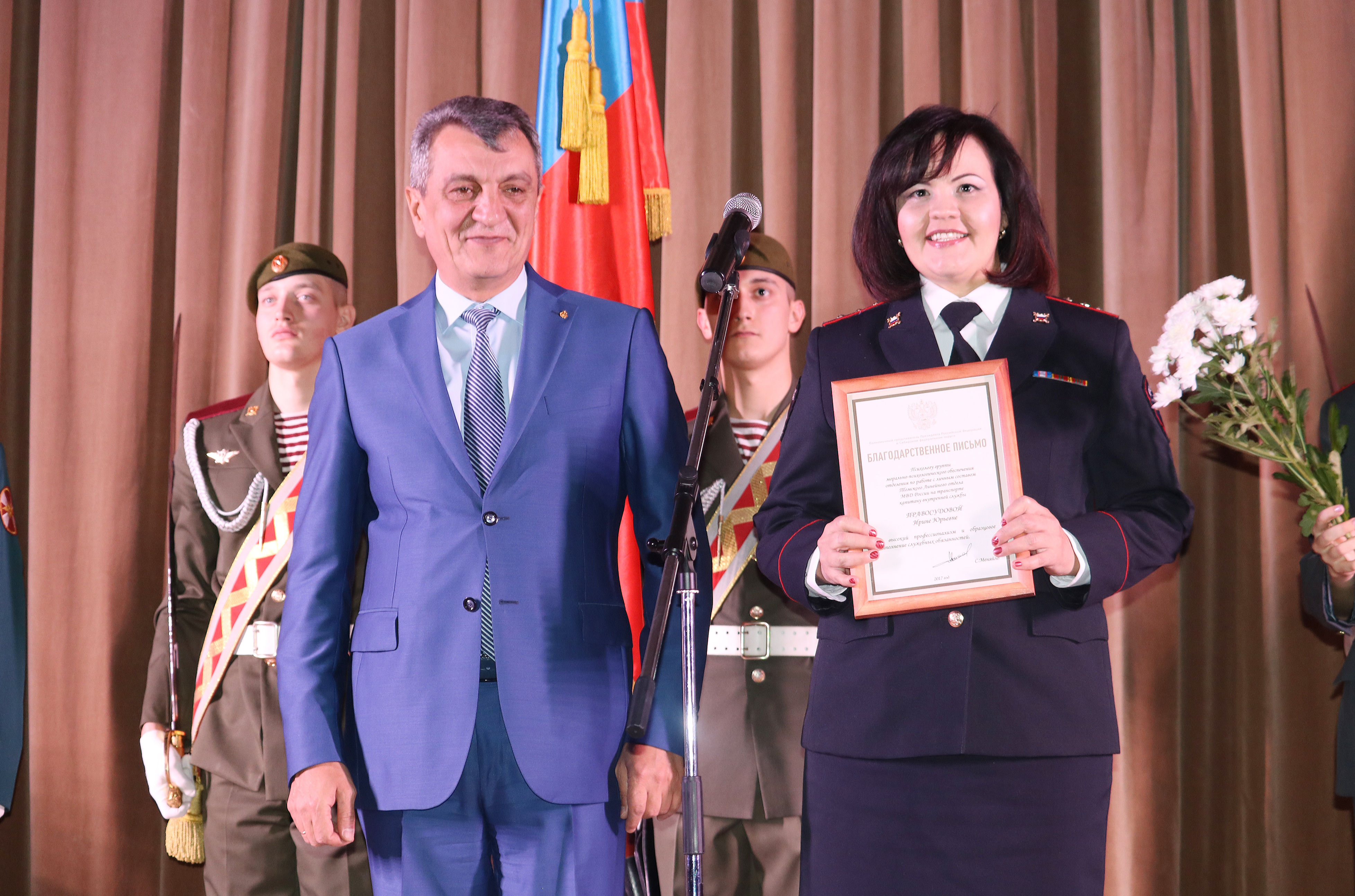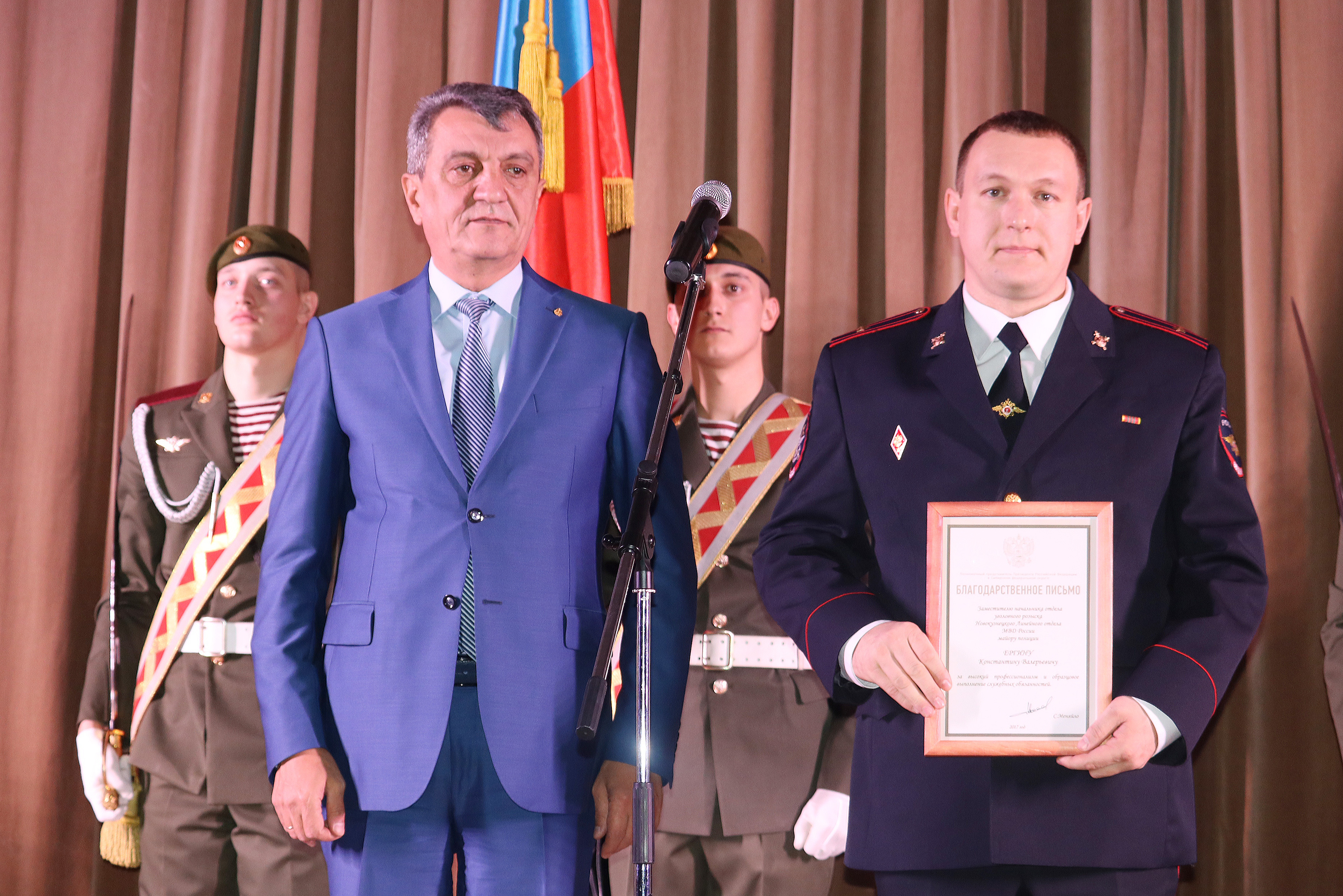 Сергей Меняйло вручил государственную награду полковнику полиции, начальнику Кузбасского линейного управления МВД России Николаю Кротовскому. В соответствии с указом Президента России Владимира Путина от 26 июня 2017 года № 283 он награждён медалью ордена «За заслуги перед Отечеством» II степени. Также сотрудникам транспортной полиции были вручены благодарственные письма полномочного представителя.