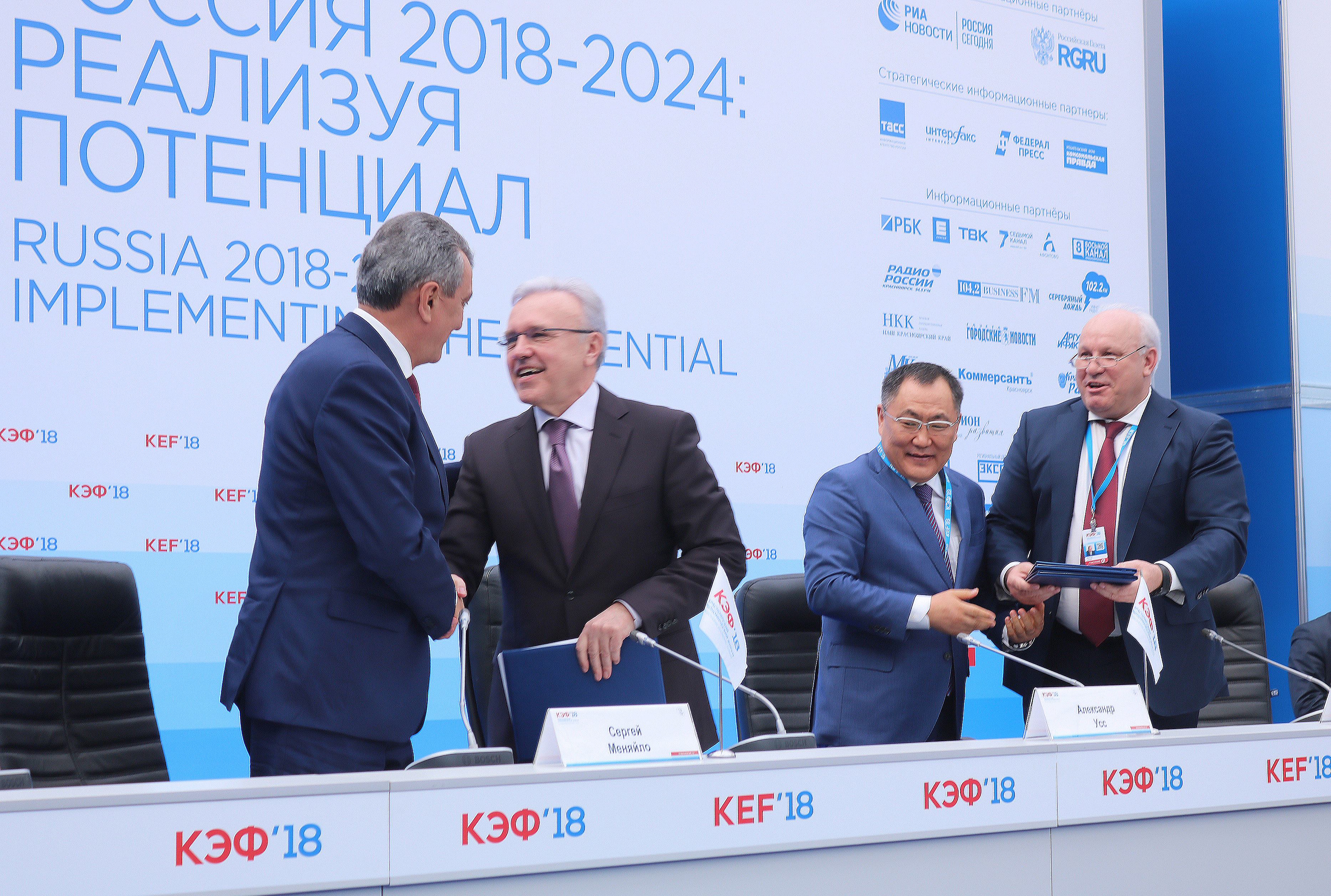 В рамках форума состоялось подписание Соглашения о реализации комплексного инвестиционного проекта «Енисейская Сибирь» между главами Красноярского края, Республики Тыва и Республики Хакасия. Цель проекта – стимулирование взаимодействия крупных межрегиональных предприятий для повышения экономической активности территорий. В формате роуд-шоу прошла презентация бизнес-инициатив, предлагаемых к реализации на территории этих субъектов Федерации, для широкого круга российских и зарубежных инвесторов, государственных институтов развития и международных организаций.